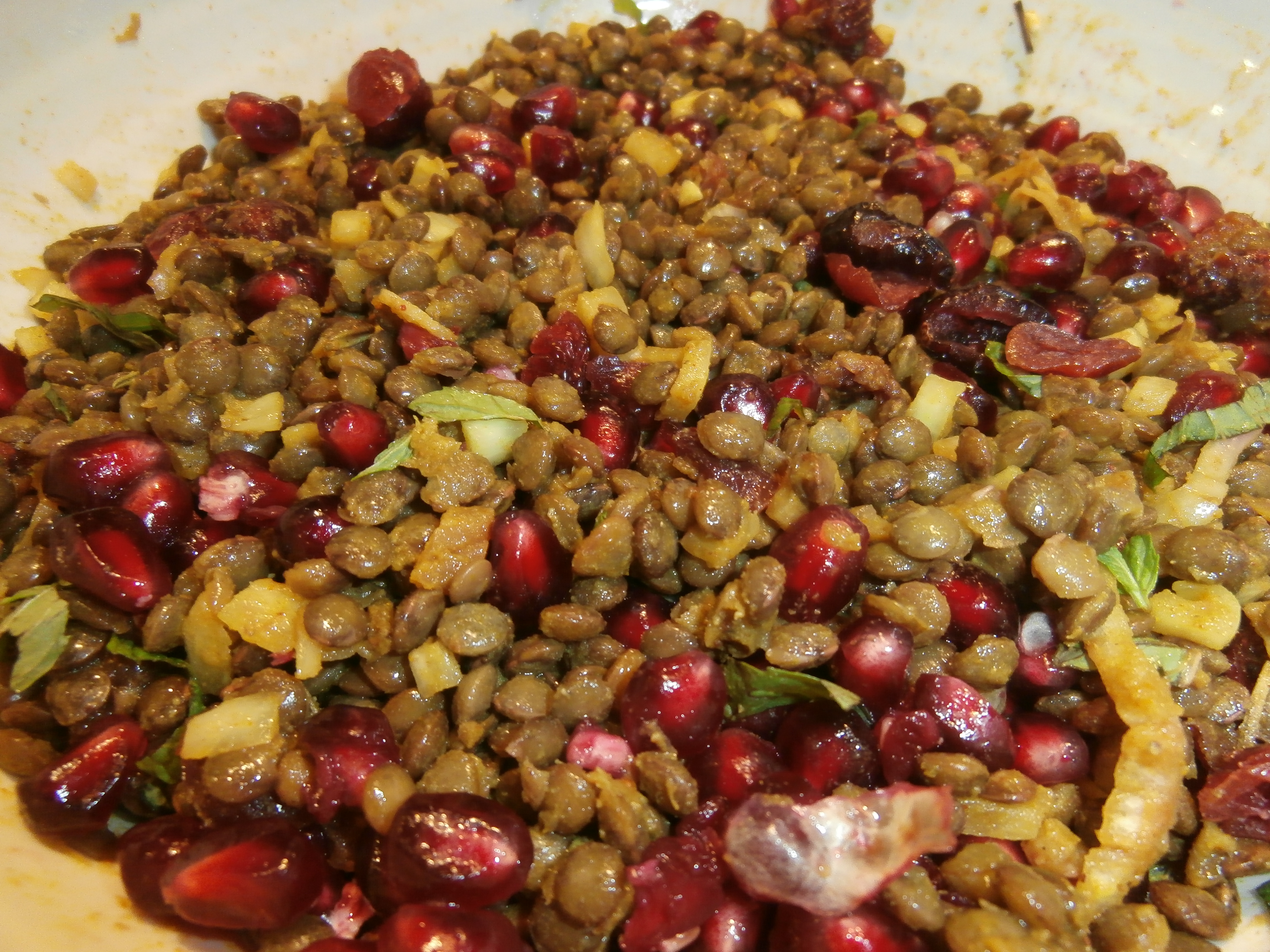Altered ever so slightly from the original My New Roots, Best Lentil Salad, Ever….Even though I enjoy Indian foods and the many spices associated with that region of the world, this is not my comfort zone of cooking.  I tend toward Mediterranean style cooking with a smattering of Asian influence and sometimes a bit of “California Mex”, but for me cooking Indian food is rare.  My husband, once (many, many years ago) bought me a Vegetarian Indian cookbook (which was one of the most thoughtful and one of the rarest gifts he’s purchased completely on his own), which I have yet to make a single recipe from.  It is not that I don’t love this gift and find many of the recipes in it interesting, but I’m scared off a bit by the looooong list of ingredients each recipe entails and not to mention the sheer weight of the book itself (which causes it to most often be used as a weight for pressing tofu, perhaps that’s why I don’t get many gifts from dear hubby, hmm).  I do get turned off by very long recipes, even though I myself when improvising a recipe tend to add more and more ingredients as I go, but I also feel unfamiliar with the combination of spices and other ingredients that go into Indian cooking and can never really imagine in my mind and taste buds what exactly the final dish is going to end up as.   So, on New Year’s Eve, searching for recipes that included foods that are said to bring good luck in the new year, I stumbled upon this recipe and decided without much thought to give it a go.  I didn’t change it much, except for the quantity of some of the ingredients and left out or changed a few that my daughter doesn’t like.  Skipped the currants and replaced them with cranberries and pomegranate seeds, the two add a nice balance of sweetness against the curry spice.  Don’t let the long list scare you off, it’s mostly items from the spice drawer and the recipe comes together fairly quickly.  What I ended up with was a lovely lightly spiced and a little bit sweet lentil salad for the new year.